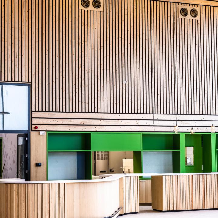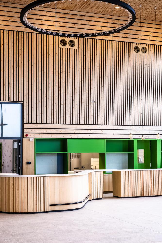 Wij maakten voor het interieur gebruik van een combinatie tussen neutrale, natuurlijke materialen en frisse wittinten en kleuraccenten. Hierdoor is een frisse, sportieve atmosfeer ontstaan. Door het toepassen van een geperforeerde houten dakplaat en een, eveneens geperforeerde, white-washed en antraciet gebeitste houten wandbeplating heeft het complex niet alleen een warme omhulling, maar ook een uitstekende ruimteakoestiek.